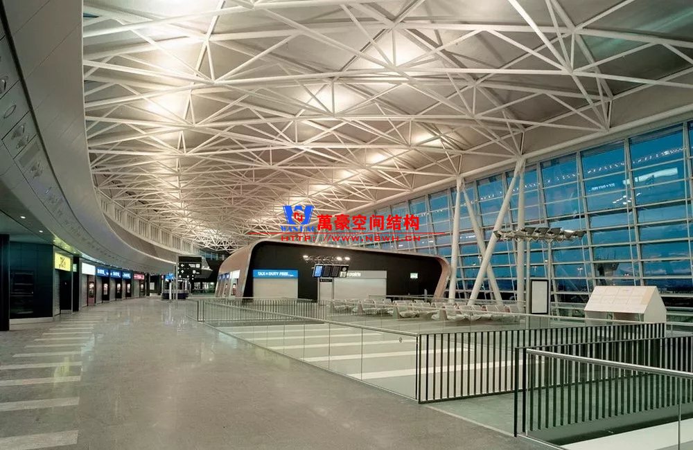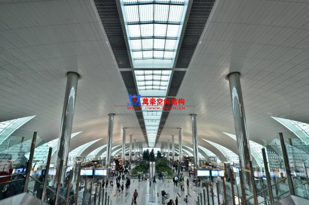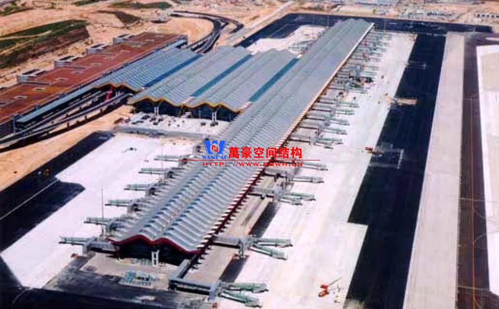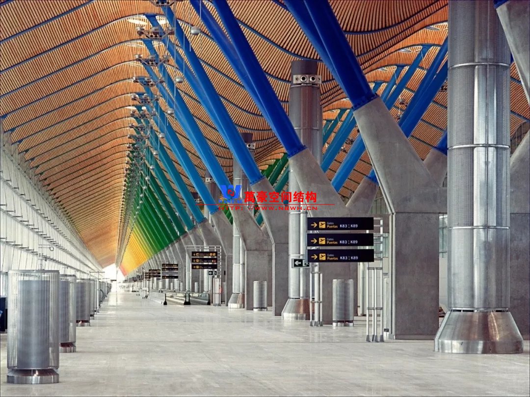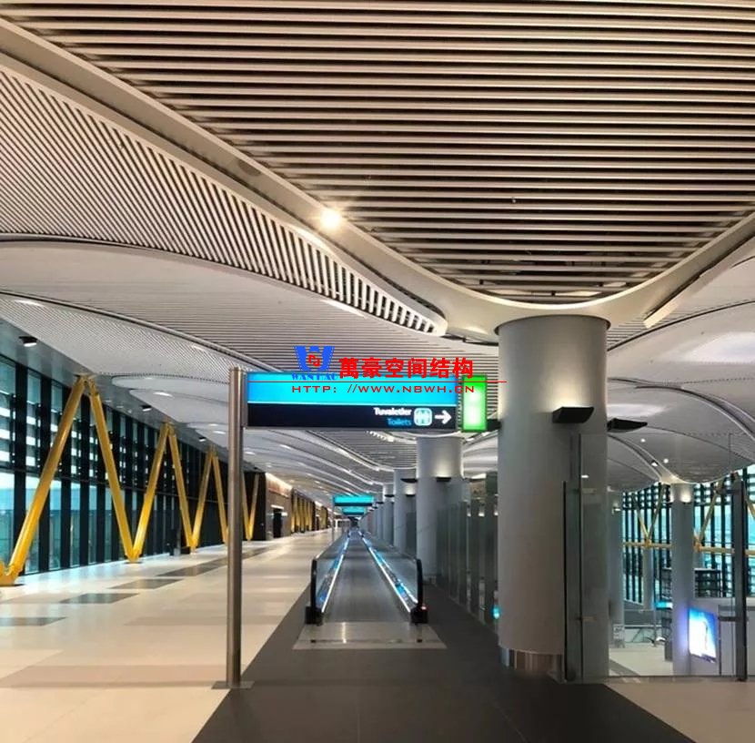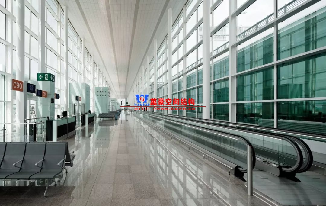 如巴塞羅那機(jī)場(chǎng)的指廊就是采用簡(jiǎn)單的鋼框架結(jié)構(gòu)體系,鋼柱布置于兩邊;幕墻采用剛性幕墻,貼近鋼柱外側(cè)布置;室內(nèi)吊頂無(wú)天窗,吊頂走向沿長(zhǎng)向,空間上有指向性。