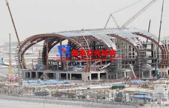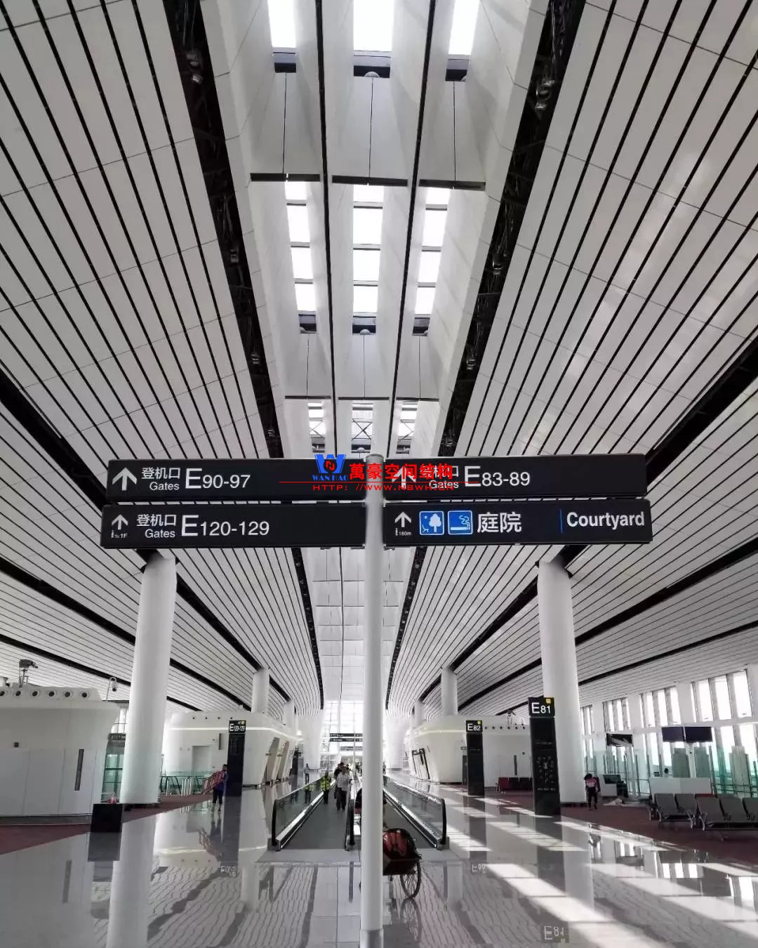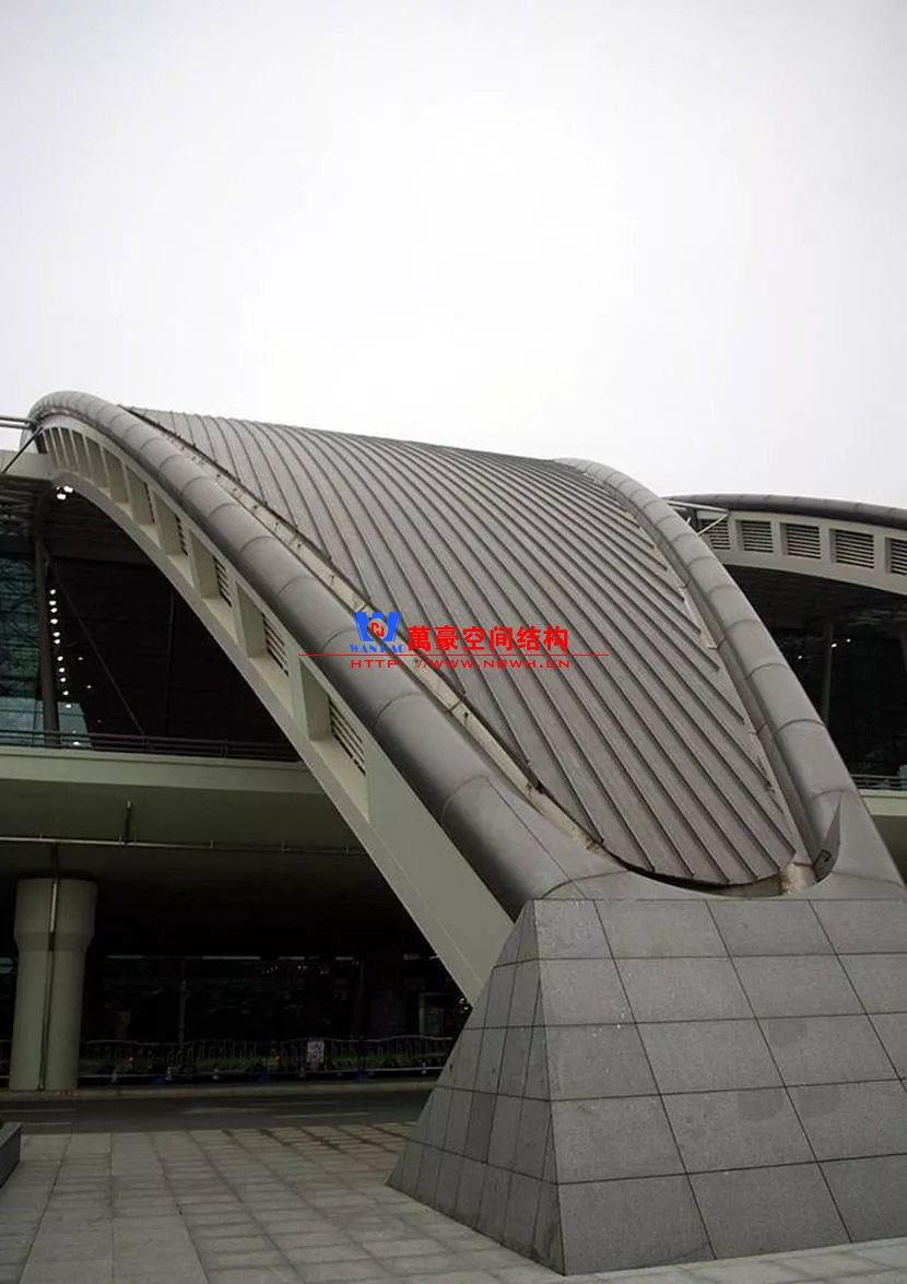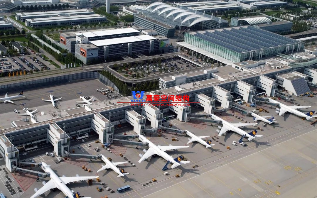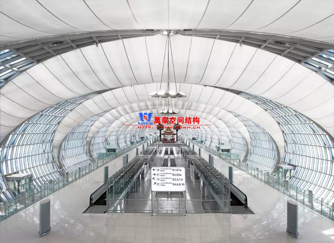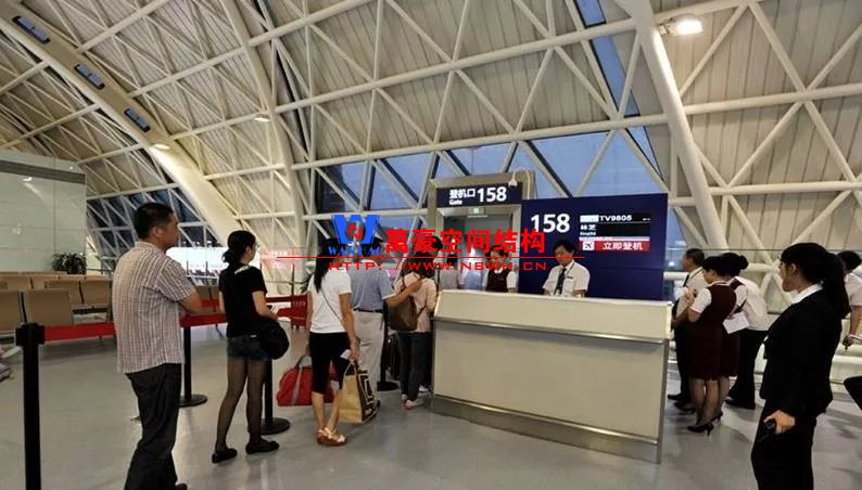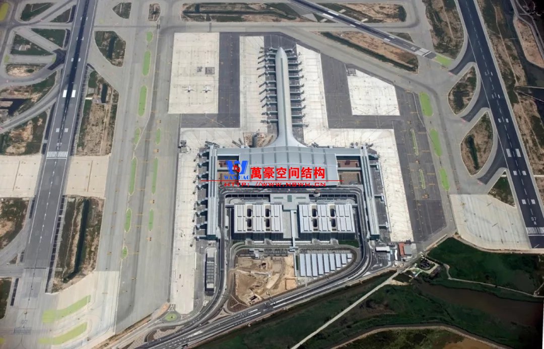 如巴塞羅那機(jī)場(chǎng)的指廊就是采用簡(jiǎn)單的鋼框架結(jié)構(gòu)體系,鋼柱布置于兩邊;幕墻采用剛性幕墻,貼近鋼柱外側(cè)布置;室內(nèi)吊頂無(wú)天窗,吊頂走向沿長(zhǎng)向,空間上有指向性。