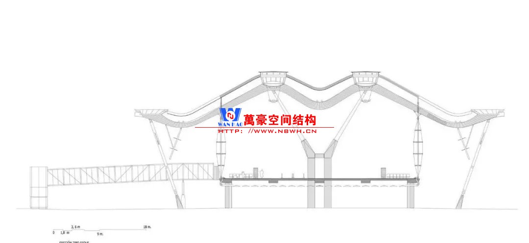 我們還可以讓平頂有些起伏變化來(lái)增加室內(nèi)效果,比如經(jīng)典的馬德里機(jī)場(chǎng)。指廊的剖面采用M形,為了應(yīng)對(duì)曲梁帶來(lái)的不利影響,工程師在中部布置了兩組Y形柱支撐于轉(zhuǎn)折點(diǎn)。