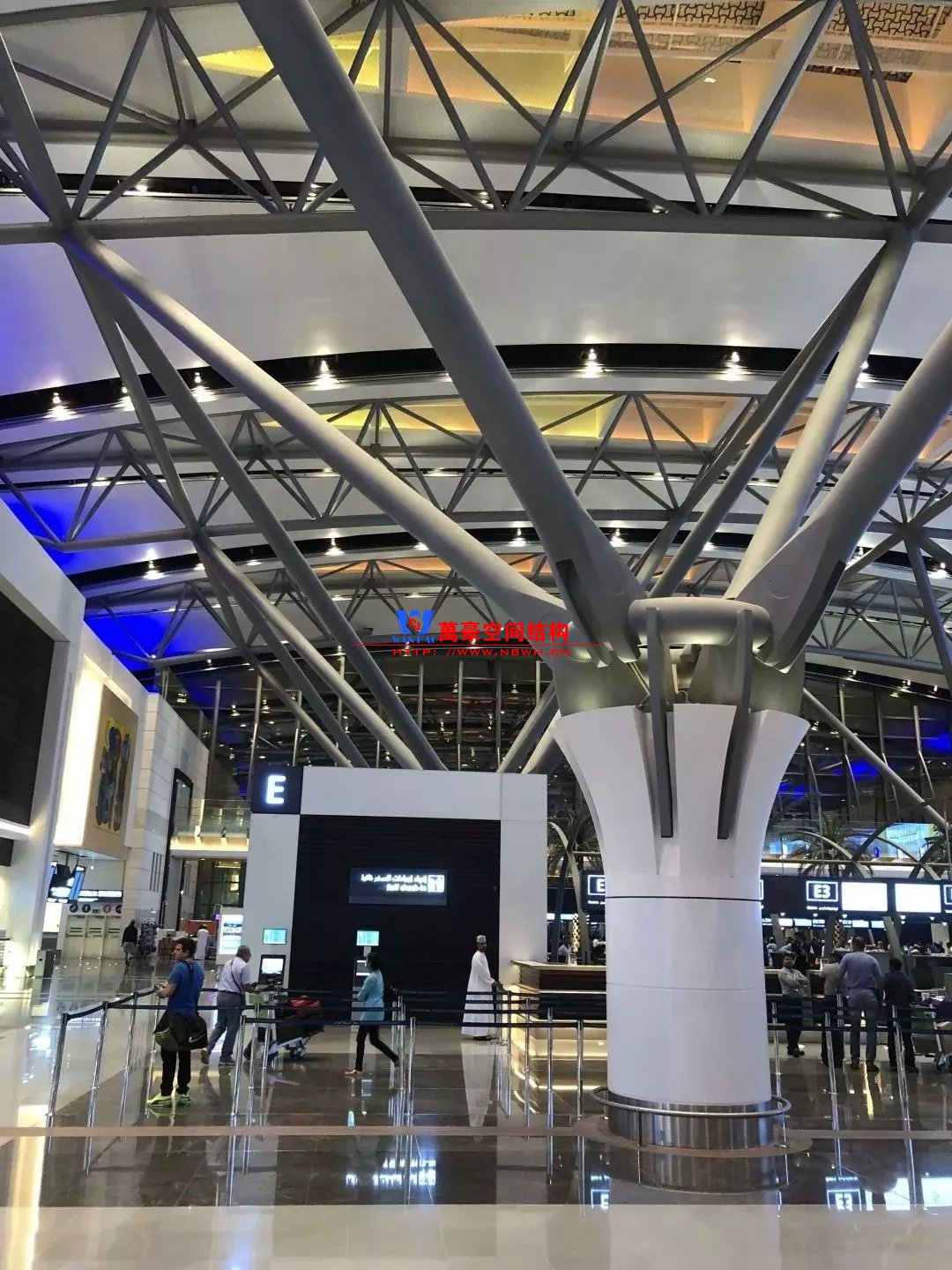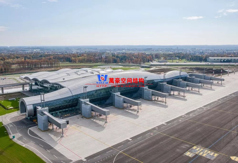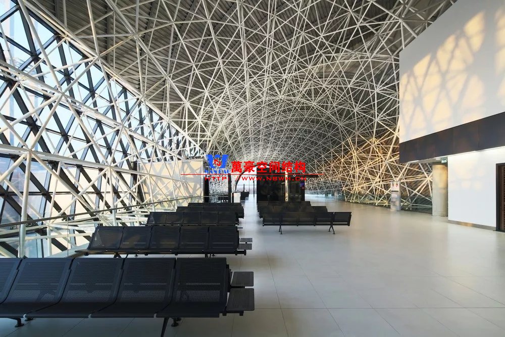 克羅地亞札格瑞布機(jī)場(chǎng)剖面也是筒形,結(jié)構(gòu)采用網(wǎng)架結(jié)構(gòu),但網(wǎng)架沒(méi)有外包。網(wǎng)架構(gòu)件和網(wǎng)架球節(jié)點(diǎn)直接暴露在近人的尺度,但從照片上看并沒(méi)有顯得很雜亂,這可能是因?yàn)榻Y(jié)構(gòu)構(gòu)件和節(jié)點(diǎn)的尺度控制的很好,細(xì)而密的構(gòu)件顯得比較精細(xì)。