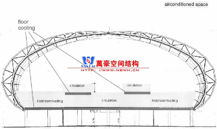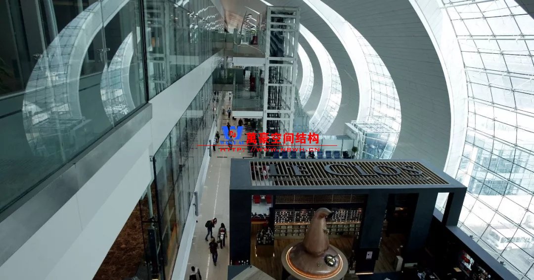 無(wú)獨(dú)有偶迪拜機(jī)場(chǎng)也是采用相似的外形,但是由于剖面并不是一個(gè)完整的拱形,因此構(gòu)件內(nèi)彎矩作用會(huì)比較明顯,因此在室內(nèi)布置了兩根柱子。立面幕墻則采用索桁架半剛性幕墻立面更加通透。與雙流機(jī)場(chǎng)不同,結(jié)構(gòu)構(gòu)件是吊頂外包的,因此外包區(qū)域采用了效率更高的主次梁體系。