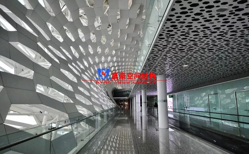 當(dāng)然也可以用萬(wàn)能的桁架和網(wǎng)架去擬合筒形的曲面,但建筑的不同處理方法,會(huì)讓最終效果呈現(xiàn)出完全不同的感覺(jué)。如深圳寶安機(jī)場(chǎng)采用桁架+網(wǎng)架的結(jié)構(gòu)體系貼合建筑的上下表皮,最終建筑做吊頂外包,建筑吊頂采用鏤空的形式表達(dá)出建筑紋理,但在縫隙中可以看到結(jié)構(gòu)構(gòu)件。