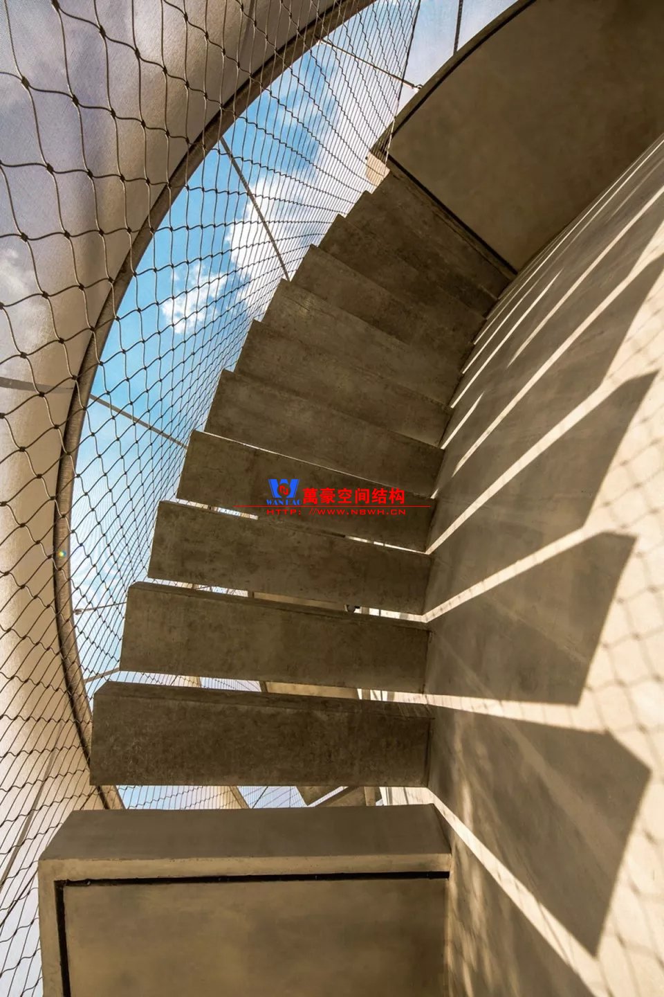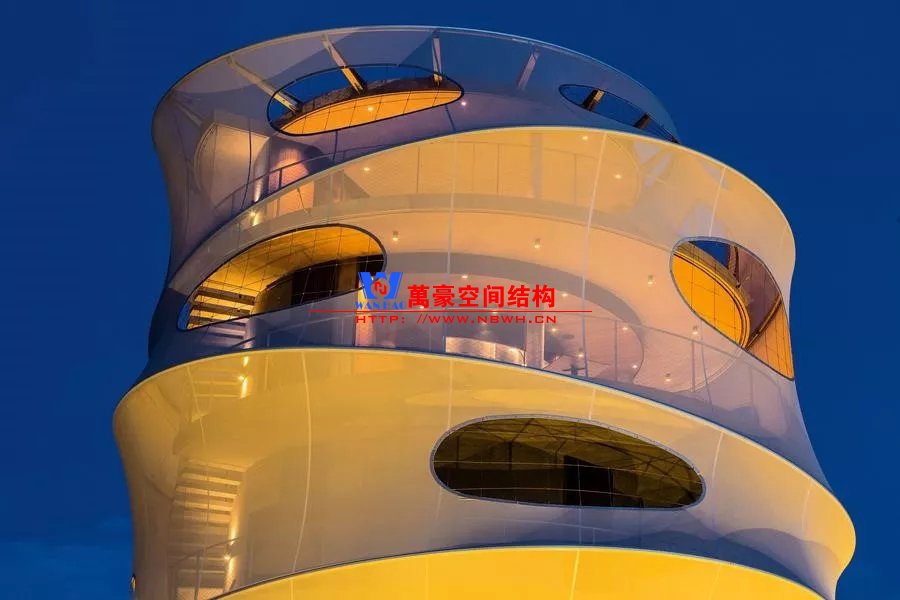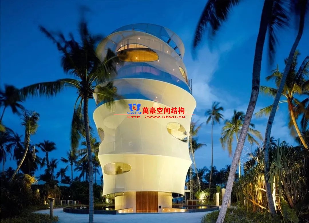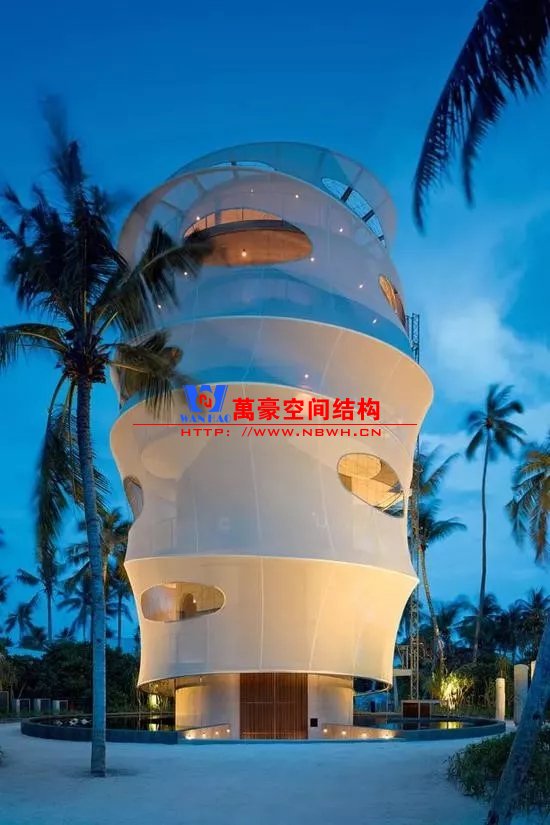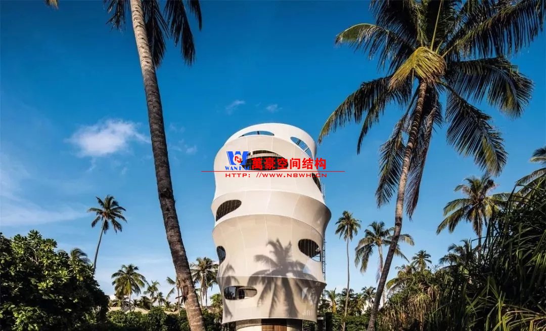與島上其他傳統(tǒng)的“塔瓦魯”風(fēng)格建筑不同,由于其高度為23米,并且采用特殊結(jié)構(gòu),目前的結(jié)構(gòu)在島上占主導(dǎo)地位。建筑物的正面使用了鋼筋混凝土整體結(jié)構(gòu),而不是傳統(tǒng)的天然材料。它用作支撐管,由各個(gè)預(yù)制臺(tái)階制成的控制臺(tái)樓梯圍繞該支撐管旋轉(zhuǎn)。外圍的所有元素都被遮蓋在淺灰色半透明的法拉利381網(wǎng)孔膜中,遮陽隔熱,又不影響視覺通透性。