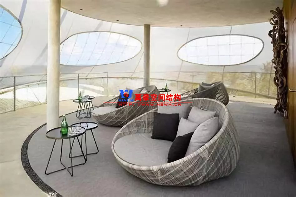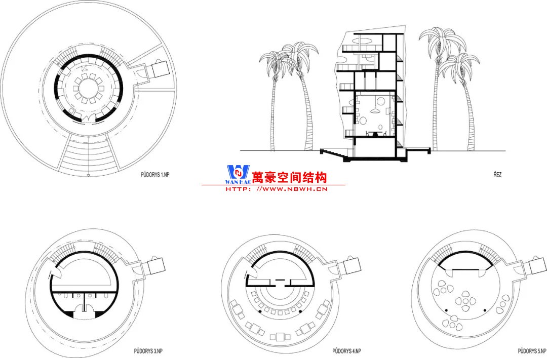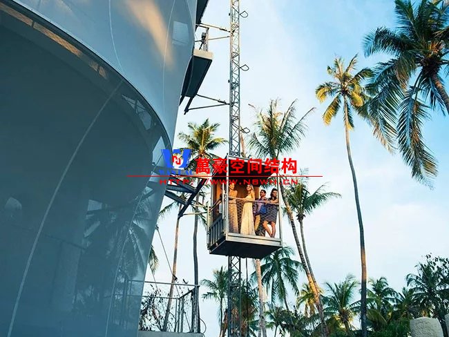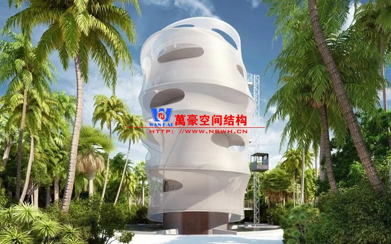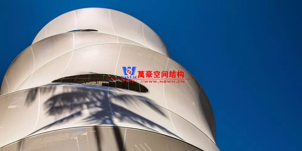 與島上其他傳統(tǒng)的“塔瓦魯”風(fēng)格建筑不同,由于其高度為23米,并且采用特殊結(jié)構(gòu),目前的結(jié)構(gòu)在島上占主導(dǎo)地位。建筑物的正面使用了鋼筋混凝土整體結(jié)構(gòu),而不是傳統(tǒng)的天然材料。它用作支撐管,由各個(gè)預(yù)制臺(tái)階制成的控制臺(tái)樓梯圍繞該支撐管旋轉(zhuǎn)。外圍的所有元素都被遮蓋在淺灰色半透明的法拉利381網(wǎng)孔膜中,遮陽隔熱,又不影響視覺通透性。