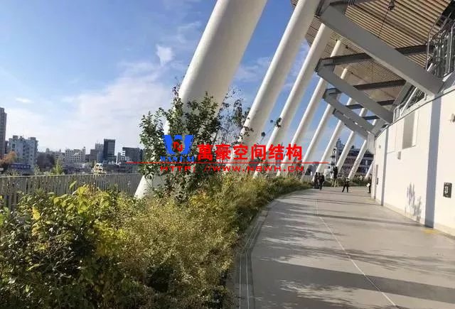 位于場館5層的環(huán)繞式室外走廊被稱為“空之森林”。這里總長度為850米,距離地面20米,種植了不同種類的植物,錯(cuò)落有致,宛若一座空中花園,與周圍神宮外苑的“大地森林”相呼應(yīng)。場館周圍栽種了約4.7萬棵植物,建筑物本身使用了來自日本47個(gè)都道府縣的木材。