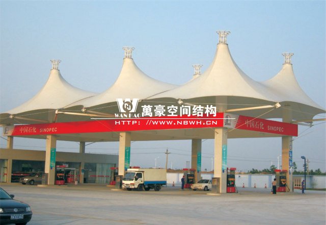 加油站膜結構,一般是指安裝在加油站的膜結構頂棚。膜結構頂棚因其自重輕,具有良好的受力特點,所以成為大跨度空間結構的主要形式之一,加油站膜結構也屬于其范疇。