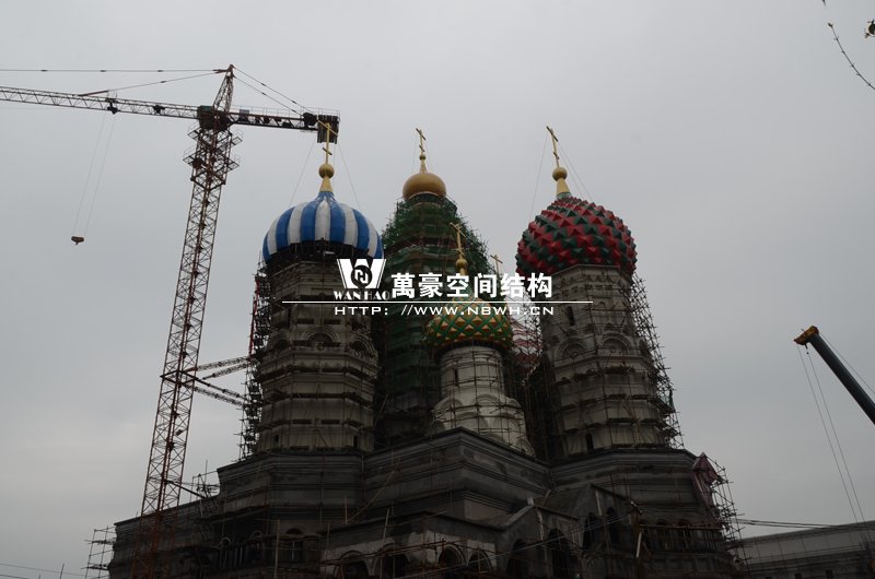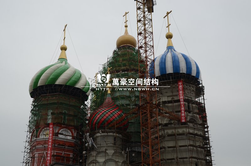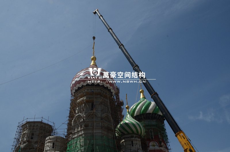 橫店圓明新園俄羅斯館屋頂整體吊裝順利完成,300多噸的大吊車,20多噸重的鋼結(jié)構(gòu)裝飾球,80米高的作業(yè)平臺(tái),在萬(wàn)豪現(xiàn)場(chǎng)管理人員和工人的緊密協(xié)調(diào)下,經(jīng)過(guò)一周的晝夜努力終于大功告成,本次吊裝從4月17日開(kāi)始,前期天氣晴朗無(wú)風(fēng),是吊裝的好天氣,吊裝也是順利進(jìn)行,之后的幾天陰雨不斷,大家為了吊裝盡快順利完成,在雨小的時(shí)候冒雨進(jìn)行吊裝,終于在4月22日吊裝正式完成。